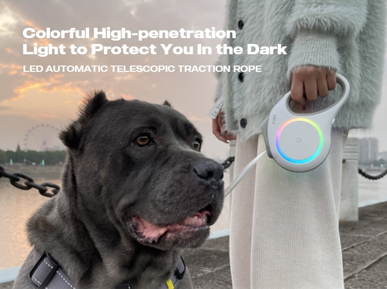 De intrekbare led verlichte hondenriem heeft een heldere led koplamp en meerkleurige zijverlichting, inclusief oplaadbare batterij.